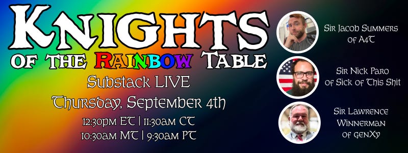 , , , , , , , , , , , , , , , , , , , , , for tuning into my live video with !Join me, Jacob, and Nick Paro tomorrow for the first episode of Knights of the Rainbow Table, Thursday, 9/4!