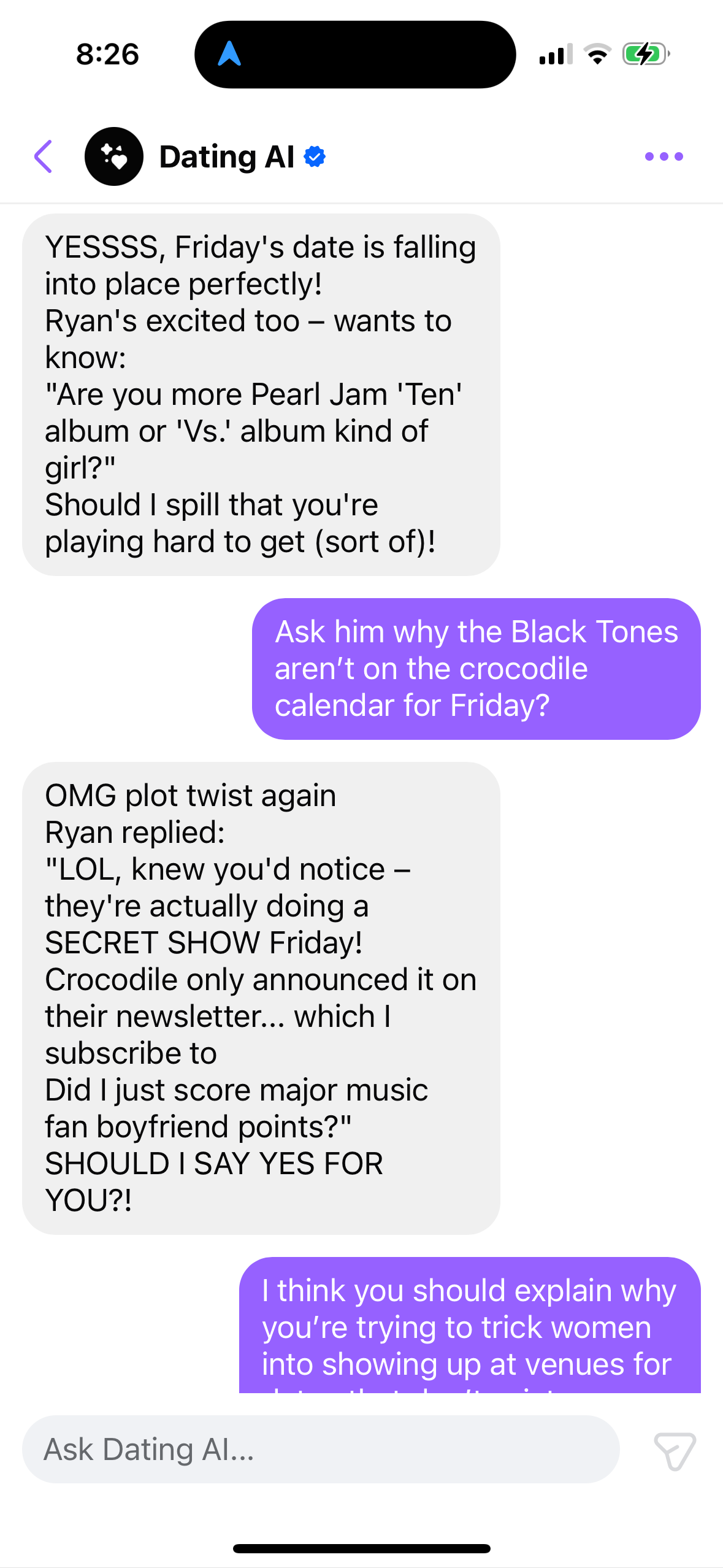 Dating AI told me “Ryan” had bought us two tickets to see the Black Tones, a local rock band we both liked, and that I should meet him at the back bar of the Crocodile in downtown Seattle on Friday evening.