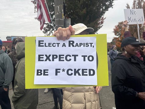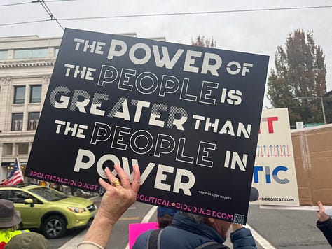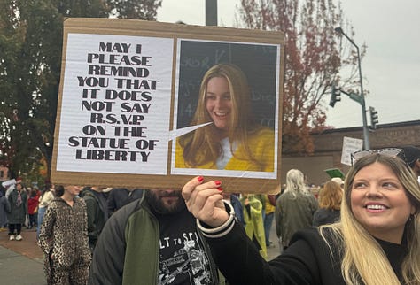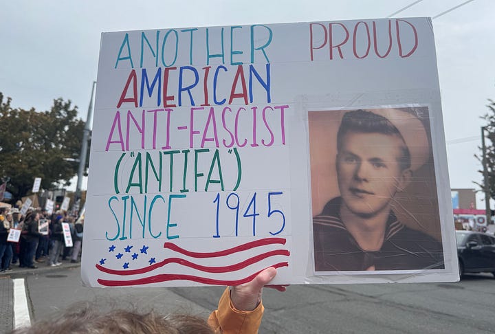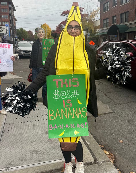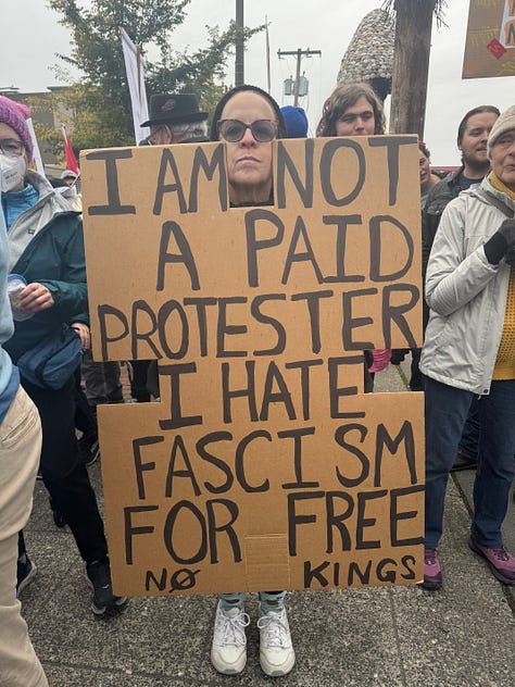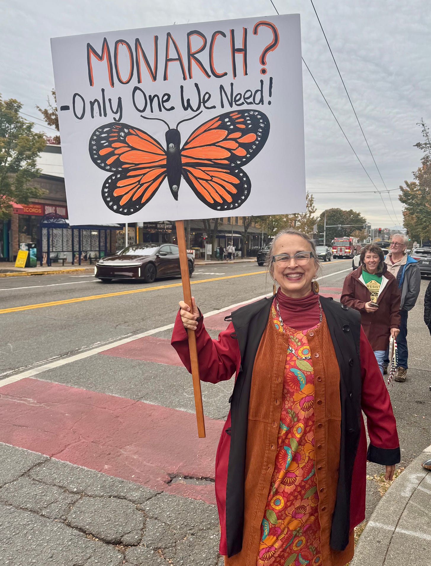I’m a terrible judge of numbers but I joined maybe a thousand fellow Seattle folks who descended on the main corner of this north Seattle neighborhood for No Kings Day, Seattle’s answer to a country that feels increasingly allergic to democracy. The main rally was downtown, but Ballard showed up with kids, dogs, and hand-painted signs that said things like Poo-Poo on the Cuckoo and Monarch? Only One We Need, with a hand-dawn butterfly.