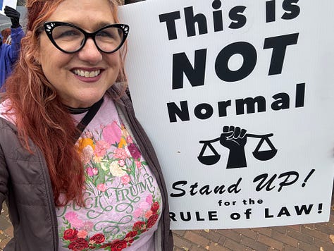 My daughter and our dog, Kira, wandered beside me. She rolled her eyes at the livestream, but I think she dug the inflatable dinosaur costume crossing the street and the Santa with Trump et al on the naughty list. And I hope she understood—it wasn’t just for fun. I hope she understood: this is what democracy looks like, as we chanted.