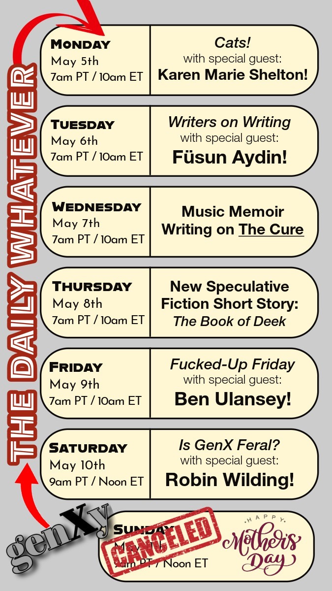 If anyone has photos or stories about their cats, please feel free to share them in the comments! Most days we’re gonna be talking about politics or hard-hitting cultural issues or digging into memoir and fiction writing.
